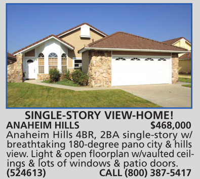 ANAHEIM HILLS $468,000 Anaheim Hills 4BR, 2BA single-story w/ breathtaking 180-degree pano city & hills view. Light & open floorplan w/vaulted ceilings & lots of windows & patio doors.