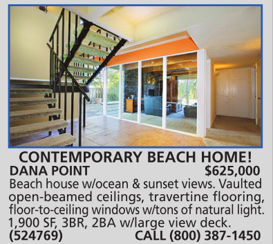 DANA POINT $625,000 Beach house w/ocean & sunset views. Vaulted open-beamed ceilings, travertine flooring,