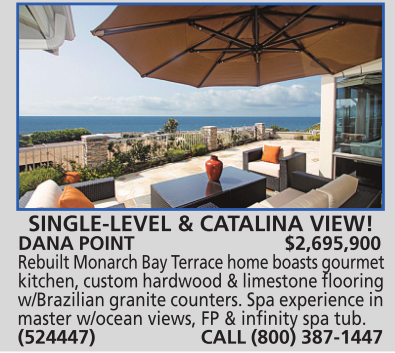 SINGLE-LEVEL & CATALINA VIEW! DANA POINT $2,695,900 Rebuilt Monarch Bay Terrace home boasts gourmet kitchen, custom hardwood & limestone flooring w/Brazilian granite counters. Spa experience in master w/ocean views, FP & infinity spa tub. (524447) CALL (800) 387-1447