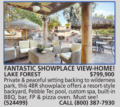 FANTASTIC SHOWPLACE VIEW-HOME! LAKE FOREST $799,900 Private & peaceful setting backing to wilderness park, this 4BR showplace offers a resort-style backyard, Pebble Tec pool, custom spa, built-in BBQ, bar, FP & pizza oven. Must see! (524499) CALL (800) 387-7930