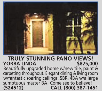 TRULY STUNNING PANO VIEWS! YORBA LINDA $825,000 Beautifully upgraded home w/new tile, paint & carpeting throughout. Elegant dining & living room w/fantastic soaring ceilings. 5BR, 4BA w/a large sumptuous master BA! Come see to believe! (524512) CALL (800) 387-1451