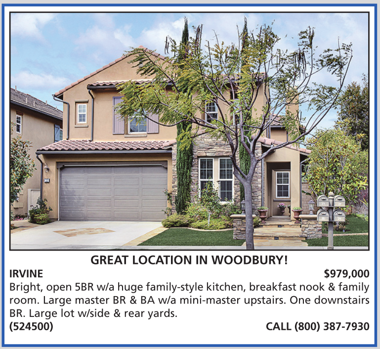 IRVINE $979,000 Bright, open 5BR w/a huge family-style kitchen, breakfast nook & family room. Large master BR & BA w/a mini-master upstairs. One downstairs BR. Large lot w/side & rear yards. (524500) CALL (800) 387-7930