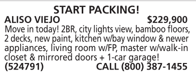 START PACKING! ALISO VIEJO $229,900 Move in today! 2BR, city lights view, bamboo floors, 2 decks, new paint, kitchen w/bay window & newer appliances, living room w/FP, master w/walk-in closet & mirrored doors + 1-car garage! (524791) CALL (800) 387-1455