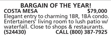 COSTA MESA $79,000 Elegant entry to charming 1BR, 1BA condo. Entertainers’ living room to lush patio w/ waterfall. Close to shops & restaurants. (524430) CALL (800) 387-7925