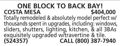 ONE BLOCK TO BACK BAY! COSTA MESA $404,000 Totally remodeled & absolutely model perfect w/ thousands spent in upgrades, including: windows, sliders, shutters, lighting, kitchen, & all 3BAs exquisitely upgraded w/travertine & tile. (524357) CALL (800) 387-7940