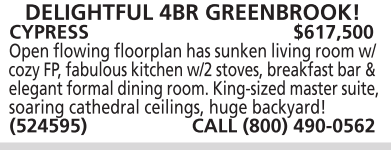 DELIGHTFUL 4BR GREENBROOK! CYPRESS $617,500 Open flowing floorplan has sunken living room w/ cozy FP, fabulous kitchen w/2 stoves, breakfast bar & elegant formal dining room. King-sized master suite, soaring cathedral ceilings, huge backyard! (524595) CALL (800) 490-0562