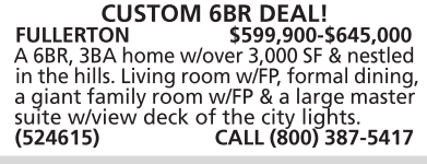 FULLERTON $599,900-$645,000 A 6BR, 3BA home w/over 3,000 SF & nestled in the hills. Living room w/FP, formal dining, a giant family room w/FP & a large master suite w/view deck of the city lights. (524615) CALL (800) 387-5417
