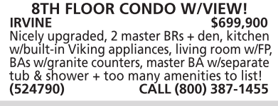 IRVINE $699,900 Nicely upgraded, 2 master BRs + den, kitchen w/built-in Viking appliances, living room w/FP, BAs w/granite counters, master BA w/separate tub & shower + too many amenities to list! (524790) CALL (800) 387-1455