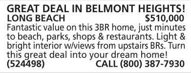 GREAT DEAL IN BELMONT HEIGHTS! LONG BEACH $510,000 Fantastic value on this 3BR home, just minutes to beach, parks, shops & restaurants. Light & bright interior w/views from upstairs BRs. Turn this great deal into your dream home! (524498) CALL (800) 387-7930