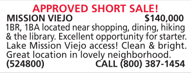 APPROVED SHORT SALE! MISSION VIEJO $140,000 1BR, 1BA located near shopping, dining, hiking & the library. Excellent opportunity for starter. Lake Mission Viejo access! Clean & bright. Great location in lovely neighborhood. (524800) CALL (800) 387-1454