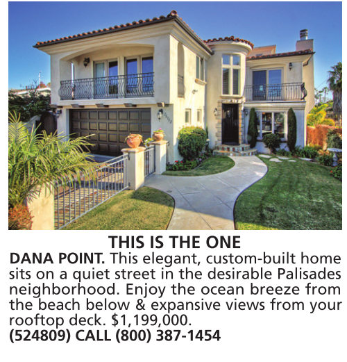 THIS IS THE ONE DANA POINT. This elegant, custom-built home sits on a quiet street in the desirable Palisades neighborhood. Enjoy the ocean breeze from the beach below & expansive views from your rooftop deck. $1,199,000. (524809) CALL (800) 387-1454