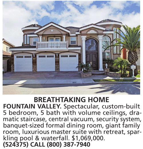 BREATHTAKING HOME FOUNTAIN VALLEY. Spectacular, custom-built 5 bedroom, 5 bath with volume ceilings, dramatic staircase, central vacuum, security system, banquet-sized formal dining room, giant family room, luxurious master suite with retreat, sparkling pool & waterfall. $1,069,000. (524375) CALL (800) 387-7940