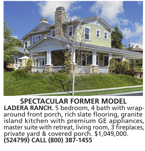 SPECTACULAR FORMER MODEL LADERA RANCH. 5 bedroom, 4 bath with wraparound front porch, rich slate flooring, granite island kitchen with premium GE appliances, master suite with retreat, living room, 3 fireplaces, private yard & covered porch. $1,049,000. (524799) CALL (800) 387-1455