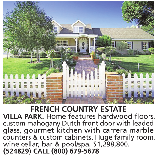 FRENCH COUNTRY ESTATE VILLA PARK. Home features hardwood floors, custom mahogany Dutch front door with leaded glass, gourmet kitchen with carrera marble counters & custom cabinets. Huge family room, wine cellar, bar & pool/spa. $1,298,800. (524829) CALL (800) 679-5678