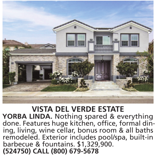 VISTA DEL VERDE ESTATE YORBA LINDA. Nothing spared & everything done. Features huge kitchen, office, formal dining, living, wine cellar, bonus room & all baths remodeled. Exterior includes pool/spa, built-in barbecue & fountains. $1,329,900. (524750) CALL (800) 679-5678