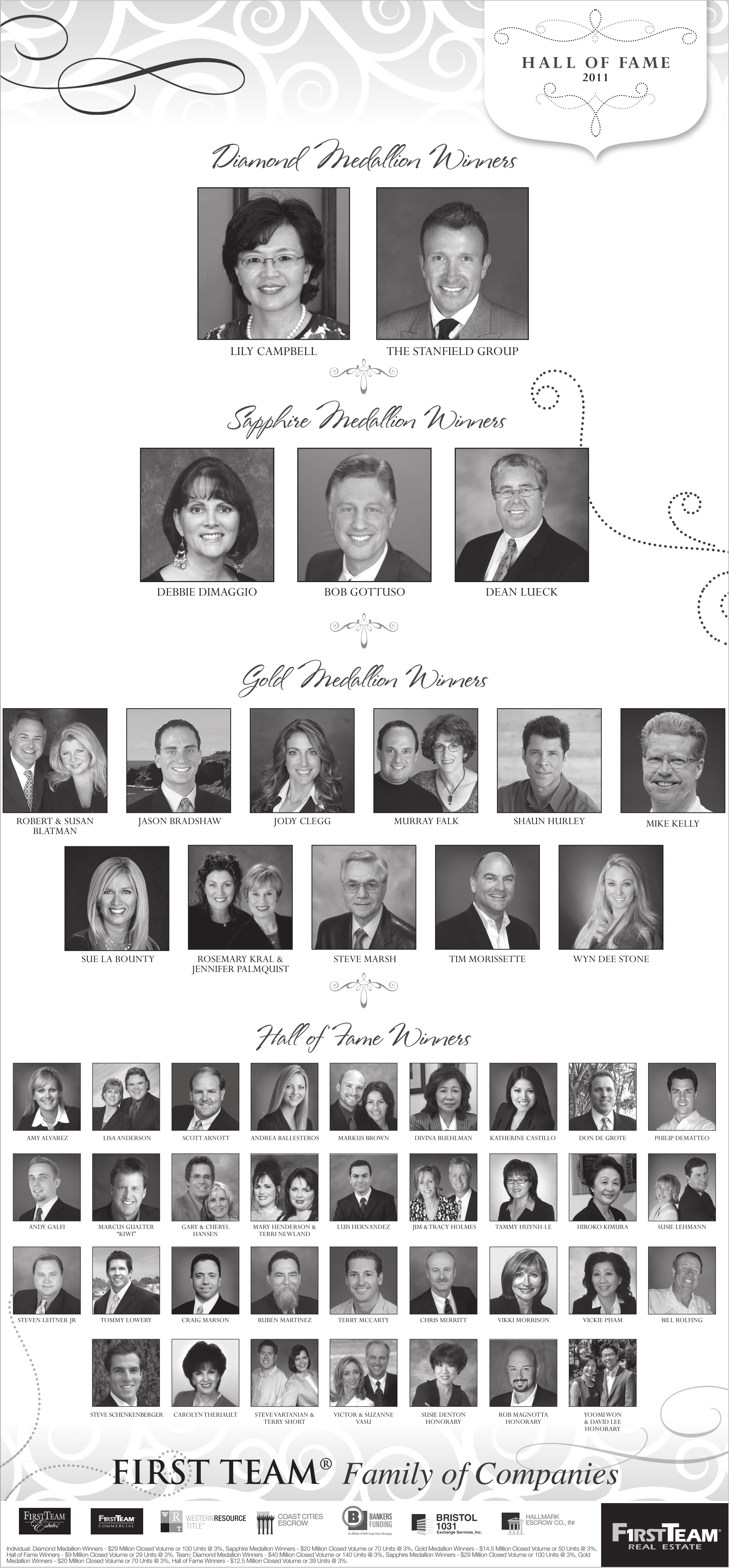 JS4 SUNDAY, MARCH 25, 2012 OC LOS ANGELES TIMES H AL L OF FAME 2011 Diamond Medallion Winners LILY CAMPBELL THE STANFIELD GROUP Sapphire Medallion Winners DEBBIE DIMAGGIO BOB GOTTUSO DEAN LUECK Gold Medallion Winners ROBERT & SUSAN BLATMAN JASON BRADSHAW JODY CLEGG MURRAY FALK SHAUN HURLEY MIKE KELLY SUE LA BOUNTY ROSEMARY KRAL & JENNIFER PALMQUIST STEVE MARSH TIM MORISSETTE WYN DEE STONE Hall of Fame Winners AMY ALVAREZ LISA ANDERSON SCOTT ARNOTT ANDREA BALLESTEROS MARKUS BROWN DIVINA BUEHLMAN KATHERINE CASTILLO DON DE GROTE PHILIP DEMATTEO ANDY GALFI MARCUS GUALTER “KIWI” GARY & CHERYL HANSEN MARY HENDERSON & TERRI NEWLAND LUIS HERNANDEZ JIM & TRACY HOLMES TAMMY HUYNH-LE HIROKO KIMURA SUSIE LEHMANN STEVEN LEITNER JR TOMMY LOWERY CRAIG MARSON RUBEN MARTINEZ TERRY MCCARTY CHRIS MERRITT VIKKI MORRISON VICKIE PHAM BILL ROLFING STEVE SCHENKENBERGER CAROLYN THERIAULT STEVE VARTANIAN & TERRY SHORT VICTOR & SUZANNE VASU SUSIE DENTON HONORARY ROB MAGNOTTA HONORARY YOOMI WON & DAVID LEE HONORARY FIRST TEAM ® Family of Companies Individual: Diamond Medallion Winners - $29 Million Closed Volume or 100 Units @ 3%, Sapphire Medallion Winners - $20 Million Closed Volume or 70 Units @ 3%, Gold Medallion Winners - $14.5 Million Closed Volume or 50 Units @ 3%, Hall of Fame Winners - $9 Million Closed Volume or 29 Units @ 3%. Team: Diamond Medallion Winners - $40 Million Closed Volume or 140 Units @ 3%, Sapphire Medallion Winners - $29 Million Closed Volume or 100 Units @ 3%, Gold Medallion Winners - $20 Million Closed Volume or 70 Units @ 3%, Hall of Fame Winners - $12.5 Million Closed Volume or 39 Units @ 3%.