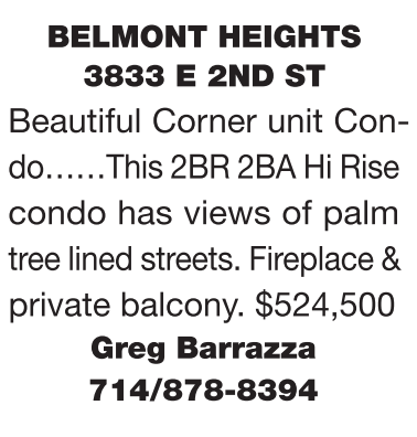BELMONT HEIGHTS 3833 E 2ND ST Beautiful Corner unit Condo……This 2BR 2BA Hi Rise condo has views of palm tree lined streets. Fireplace & private balcony. $524,500 Greg Barrazza 714/878-8394