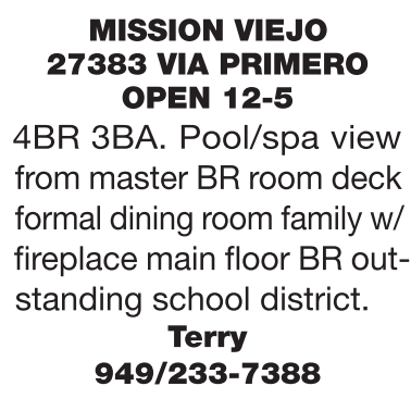 MISSION VIEJO 27383 VIA PRIMERO OPEN 12-5 4BR 3BA. Pool/spa view from master BR room deck formal dining room family w/ fireplace main floor BR outstanding school district.