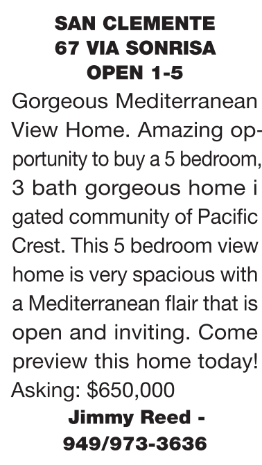 SAN CLEMENTE 67 VIA SONRISA OPEN 1-5 Gorgeous Mediterranean View Home. Amazing opportunity to buy a 5 bedroom, 3 bath gorgeous home i gated community of Pacific Crest. This 5 bedroom view home is very spacious with a Mediterranean flair that is open and inviting. Come preview this home today! Asking: $650,000 Jimmy Reed - 949/973-3636