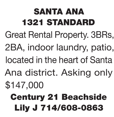 SANTA ANA 1321 STANDARD Great Rental Property. 3BRs, 2BA, indoor laundry, patio, located in the heart of Santa Ana district. Asking only $147,000 Century 21 Beachside Lily J 714/608-0863