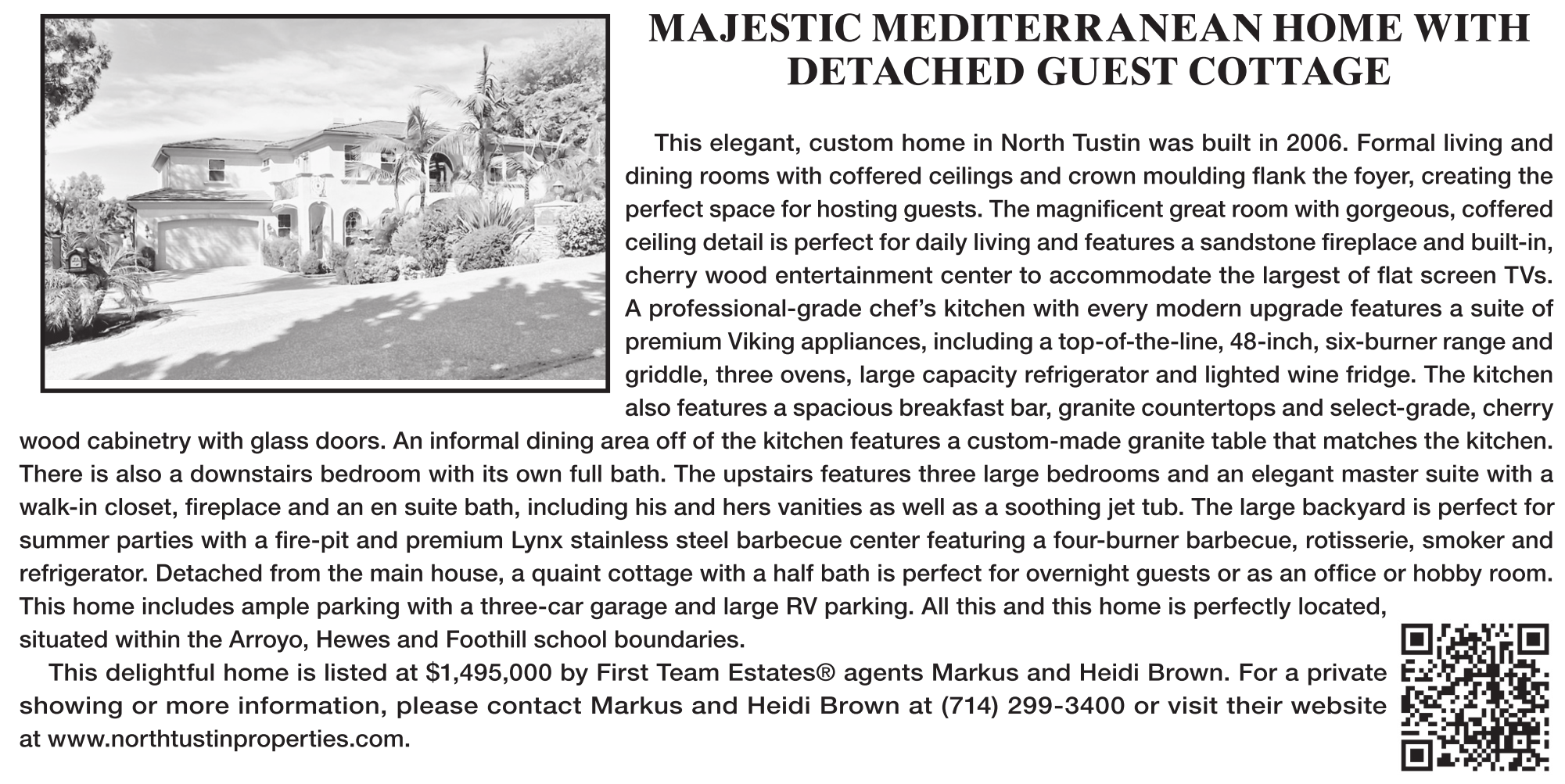 This delightful home is listed at $1,495,000 by First Team Estates® agents Markus and Heidi Brown. For a private showing or more information, please contact Markus and Heidi Brown at (714) 299-3400 or visit their website at www.northtustinproperties.com.