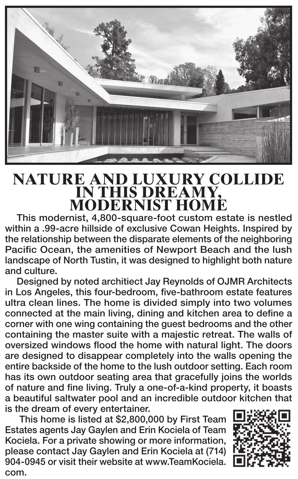 This home is listed at $2,800,000 by First Team Estates agents Jay Gaylen and Erin Kociela of Team Kociela. For a private showing or more information, please contact Jay Gaylen and Erin Kociela at (714) 904-0945 or visit their website at www.TeamKociela. com.