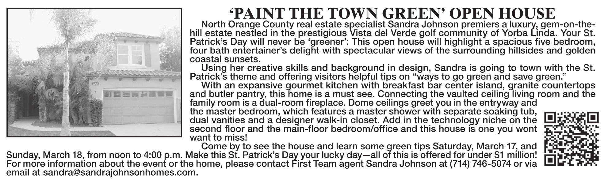 Come by to see the house and learn some green tips Saturday, March 17, and Sunday, March 18, from noon to 4:00 p.m. Make this St. Patrick’s Day your lucky day—all of this is offered for under $1 million! For more information about the event or the home, please contact First Team agent Sandra Johnson at (714) 746-5074 or via email at sandra@sandrajohnsonhomes.com.