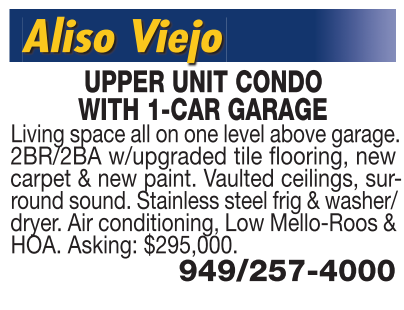 UPPER UNIT CONDO WITH 1-CAR GARAGE Living space all on one level above garage. 2BR/2BA w/upgraded tile flooring, new carpet & new paint. Vaulted ceilings, surround sound. Stainless steel frig & washer/ dryer. Air conditioning, Low Mello-Roos & HOA. Asking: $295,000.