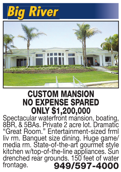 Big River CUSTOM MANSION NO EXPENSE SPARED ONLY $1,200,000 Spectacular waterfront mansion, boating, 8BR, & 5BAs. Private 2 acre lot. Dramatic “Great Room.” Entertainment-sized frml liv rm. Banquet size dining. Huge game/ media rm. State-of-the-art gourmet style kitchen w/top-of-the-line appliances. Sun drenched rear grounds. 150 feet of water frontage. 949/597-4000
