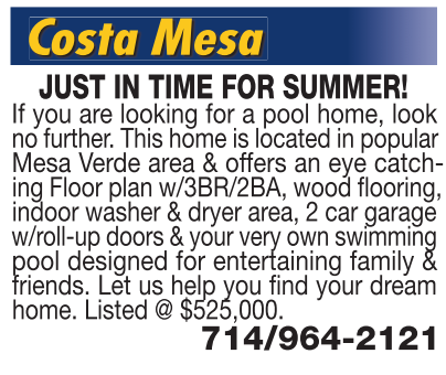 Costa Mesa JUST IN TIME FOR SUMMER! If you are looking for a pool home, look no further. This home is located in popular Mesa Verde area & offers an eye catching Floor plan w/3BR/2BA, wood flooring, indoor washer & dryer area, 2 car garage w/roll-up doors & your very own swimming pool designed for entertaining family & friends. Let us help you find your dream home. Listed @ $525,000. 714/964-2121