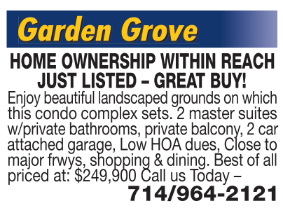 Garden Grove HOME OWNERSHIP WITHIN REACH JUST LISTED – GREAT BUY! Enjoy beautiful landscaped grounds on which this condo complex sets. 2 master suites w/private bathrooms, private balcony, 2 car attached garage, Low HOA dues, Close to major frwys, shopping & dining. Best of all priced at: $249,900 Call us Today – 714/964-2121