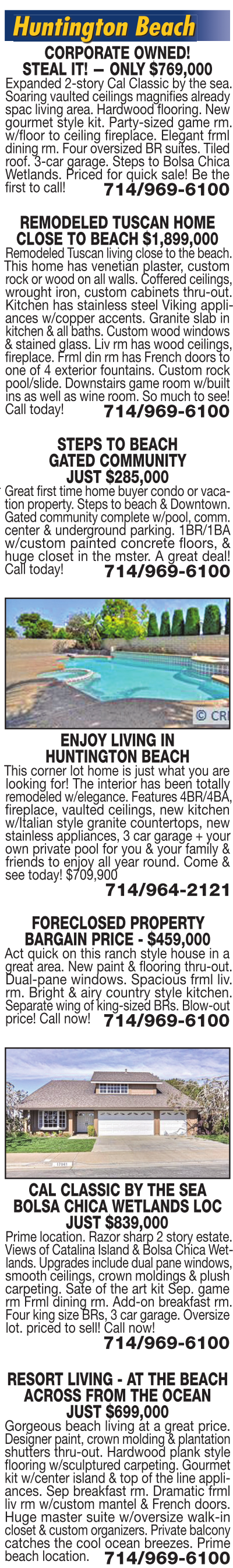 ENJOY LIVING IN HUNTINGTON BEACH This corner lot home is just what you are looking for! The interior has been totally remodeled w/elegance. Features 4BR/4BA, fireplace, vaulted ceilings, new kitchen w/Italian style granite countertops, new stainless appliances, 3 car garage + your own private pool for you & your family & friends to enjoy all year round. Come & see today! $709,900 714/964-2121