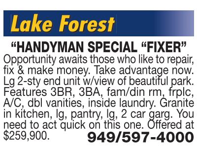 “HANDYMAN SPECIAL “FIXER” Opportunity awaits those who like to repair, fix & make money. Take advantage now. Lg 2-sty end unit w/view of beautiful park. Features 3BR, 3BA, fam/din rm, frplc, A/C, dbl vanities, inside laundry. Granite in kitchen, lg, pantry, lg, 2 car garg. You need to act quick on this one. Offered at $259,900. 949/597-4000