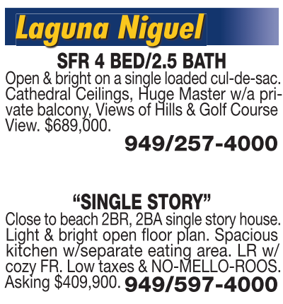“SINGLE STORY” Close to beach 2BR, 2BA single story house. Light & bright open floor plan. Spacious kitchen w/separate eating area. LR w/ cozy FR. Low taxes & NO-MELLO-ROOS. Asking $409,900. 949/597-4000