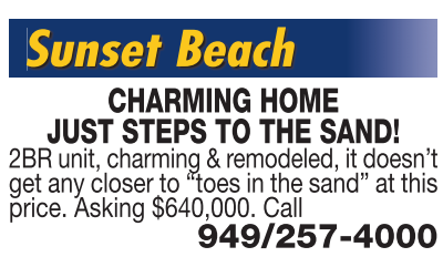 2BR unit, charming & remodeled, it doesn’t get any closer to “toes in the sand” at this price. Asking $640,000. Call 949/257-4000