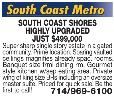 SOUTH COAST SHORES HIGHLY UPGRADED JUST $499,000 Super sharp single story estate in a gated community. Prime location. Soaring vaulted ceilings magnifies already spac. rooms. Banquet size frml dining rm. Gourmet style kitchen w/sep eating area. Private wing of king size BRs including an oversize master suite. Priced for quick sale! Be the first to call! 714/969-6100