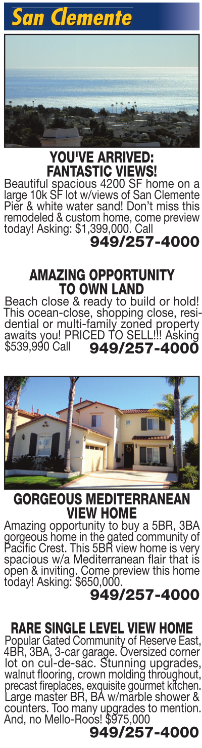 San Clemente YOU'VE ARRIVED: FANTASTIC VIEWS! Beautiful spacious 4200 SF home on a large 10k SF lot w/views of San Clemente Pier & white water sand! Don’t miss this remodeled & custom home, come preview today! Asking: $1,399,000. Call 949/257-4000 AMAZING OPPORTUNITY TO OWN LAND Beach close & ready to build or hold! This ocean-close, shopping close, residential or multi-family zoned property awaits you! PRICED TO SELL!!! Asking $539,990 Call 949/257-4000 GORGEOUS MEDITERRANEAN VIEW HOME Amazing opportunity to buy a 5BR, 3BA gorgeous home in the gated community of Pacific Crest. This 5BR view home is very spacious w/a Mediterranean flair that is open & inviting. Come preview this home today! Asking: $650,000. 949/257-4000 RARE SINGLE LEVEL VIEW HOME Popular Gated Community of Reserve East, 4BR, 3BA, 3-car garage. Oversized corner lot on cul-de-sac. Stunning upgrades, walnut flooring, crown molding throughout, precast fireplaces, exquisite gourmet kitchen. Large master BR, BA w/marble shower & counters. Too many upgrades to mention. And, no Mello-Roos! $975,000 949/257-4000