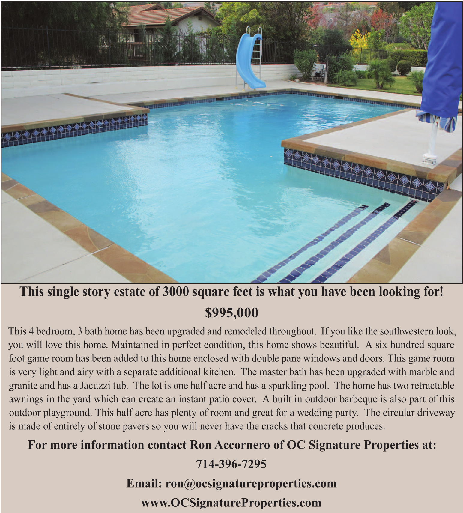 This single story estate of 3000 square feet is what you have been looking for! $995,000 This 4 bedroom, 3 bath home has been upgraded and remodeled throughout. If you like the southwestern look, you will love this home. Maintained in perfect condition, this home shows beautiful. A six hundred square foot game room has been added to this home enclosed with double pane windows and doors. This game room is very light and airy with a separate additional kitchen. The master bath has been upgraded with marble and granite and has a Jacuzzi tub. The lot is one half acre and has a sparkling pool. The home has two retractable awnings in the yard which can create an instant patio cover. A built in outdoor barbeque is also part of this outdoor playground. This half acre has plenty of room and great for a wedding party. The circular driveway is made of entirely of stone pavers so you will never have the cracks that concrete produces. For more information contact Ron Accornero of OC Signature Properties at: 714-396-7295 Email: ron@ocsignatureproperties.com www.OCSignatureProperties.com
