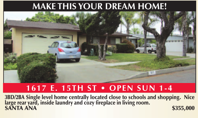 3BD/2BA Single level home centrally located close to schools and shopping. Nice large rear yard, inside laundry and cozy fireplace in living room. SANTA ANA $355,000