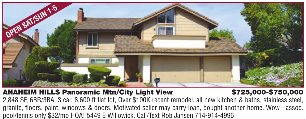 ANAHEIM HILLS Panoramic Mtn/City Light View $725,000-$750,000 2,848 SF, 6BR/3BA, 3 car, 8,600 ft flat lot, Over $100K recent remodel, all new kitchen & baths, stainless steel, granite, floors, paint, windows & doors. Motivated seller may carry loan, bought another home. Wow - assoc. pool/tennis only $32/mo HOA! 5449 E Willowick. Call/Text Rob Jansen 714-914-4996