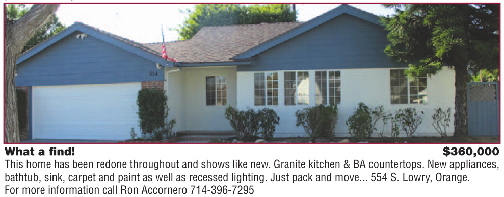 What a find! $360,000 This home has been redone throughout and shows like new. Granite kitchen & BA countertops. New appliances, bathtub, sink, carpet and paint as well as recessed lighting. Just pack and move... 554 S. Lowry, Orange. For more information call Ron Accornero 714-396-7295