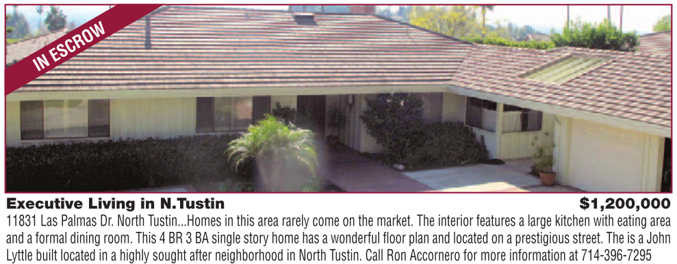 Executive Living in N.Tustin $1,200,000 11831 Las Palmas Dr. North Tustin...Homes in this area rarely come on the market. The interior features a large kitchen with eating area and a formal dining room. This 4 BR 3 BA single story home has a wonderful fl oor plan and located on a prestigious street. The is a John Lyttle built located in a highly sought after neighborhood in North Tustin. Call Ron Accornero for more information at 714-396-7295