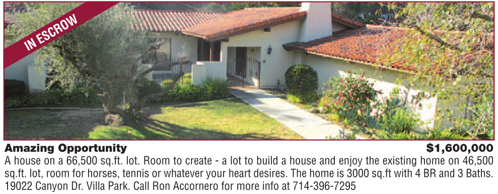 Amazing Opportunity $1,600,000 A house on a 66,500 sq.ft. lot. Room to create - a lot to build a house and enjoy the existing home on 46,500 sq.ft. lot, room for horses, tennis or whatever your heart desires. The home is 3000 sq.ft with 4 BR and 3 Baths. 19022 Canyon Dr. Villa Park. Call Ron Accornero for more info at 714-396-7295