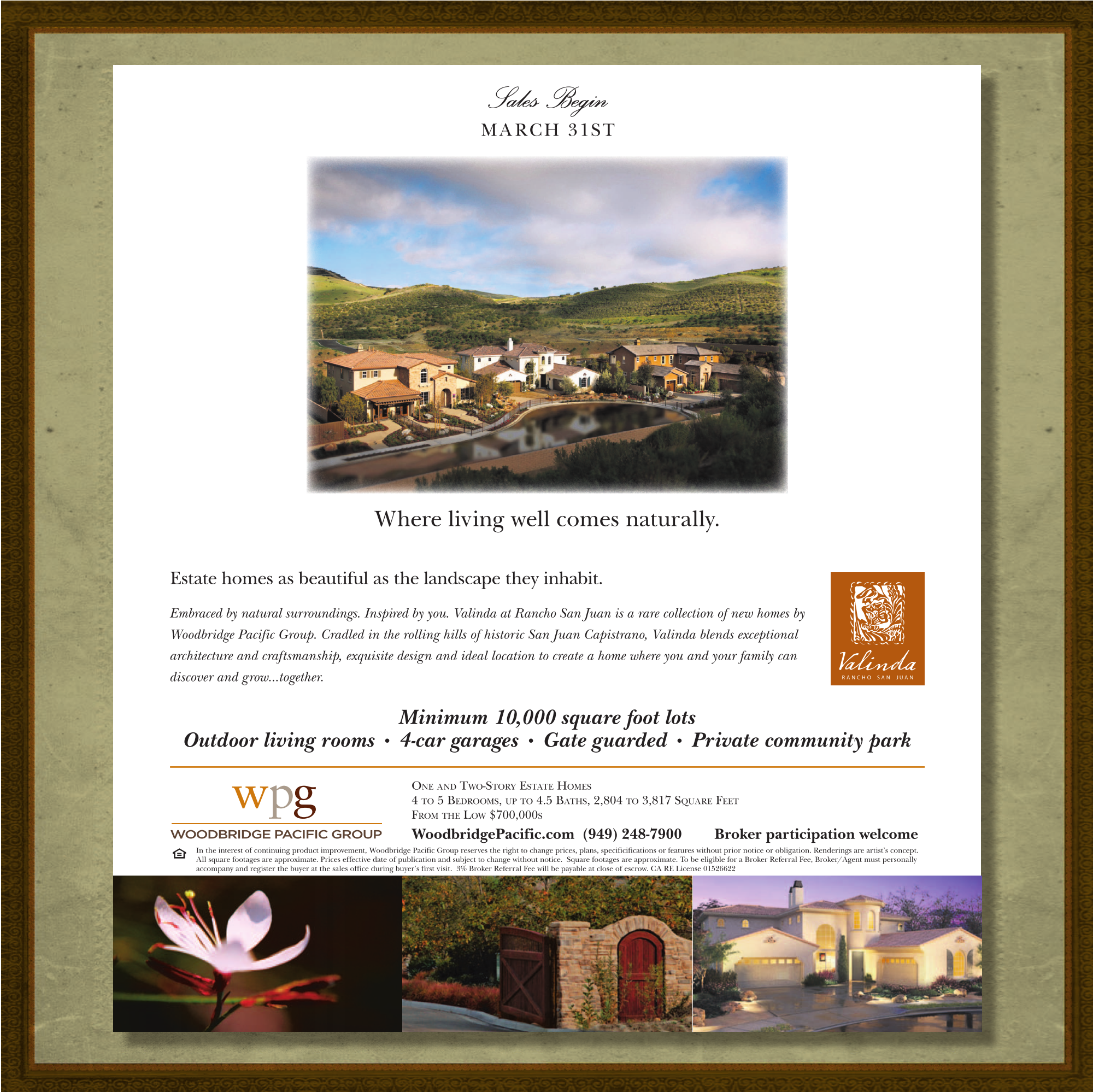 In the interest of continuing product improvement, Woodbridge Pacific Group reserves the right to change prices, plans, specificifications or features without prior notice or obligation. Renderings are artist’s concept. All square footages are approximate. Prices effective date of publication and subject to change without notice. Square footages are approximate. To be eligible for a Broker Referral Fee, Broker/Agent must personally accompany and register the buyer at the sales office during buyer’s first visit. 3% Broker Referral Fee will be payable at close of escrow. CA RE License 01526622