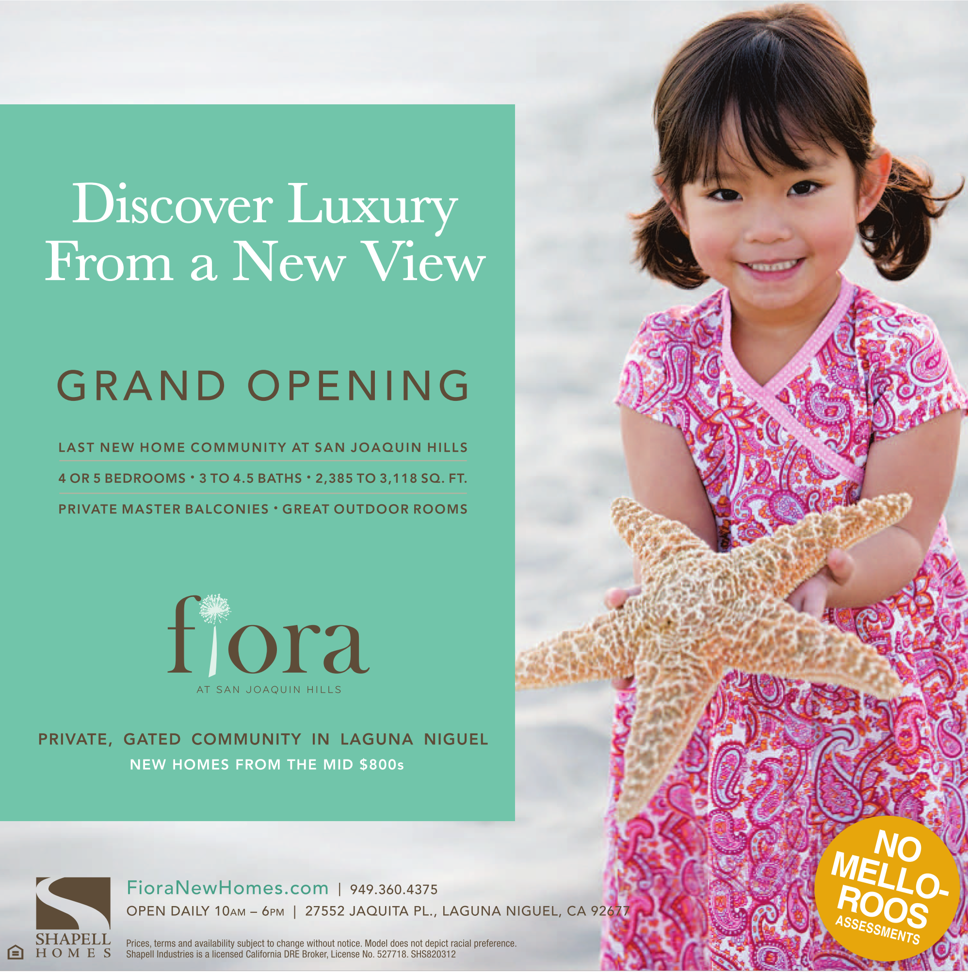 Discover Luxury From a New View G R A N D O P E N I N G LAST NEW HOME COMMUNITY AT SAN JOAQUIN HILLS 4 OR 5 BEDROOMS • 3 TO 4.5 BATHS • 2,385 TO 3,118 SQ. FT. PRIVATE MASTER BALCONIES • GREAT OUTDOOR ROOMS PRIVATE, GATED COMMUNITY IN LAGUNA NIGUEL NEW HOMES FROM THE MID $800s FioraNewHomes.com | 949.360.4375 OPEN DAILY 10AM – 6PM | 27552 JAQUITA PL., LAGUNA NIGUEL, CA 92677 Prices, terms and availability subject to change without notice. Model does not depict racial preference. Shapell Industries is a licensed California DRE Broker, License No. 527718. SHS820312