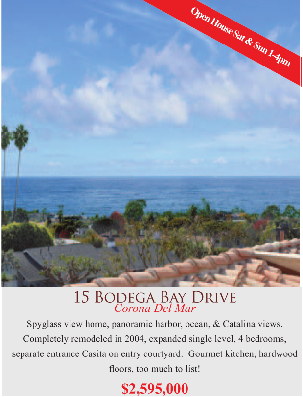 15 Bodega Bay Drive Corona Del Mar Spyglass view home, panoramic harbor, ocean, & Catalina views. Completely remodeled in 2004, expanded single level, 4 bedrooms, separate entrance Casita on entry courtyard. Gourmet kitchen, hardwood floors, too much to list! $2,595,000