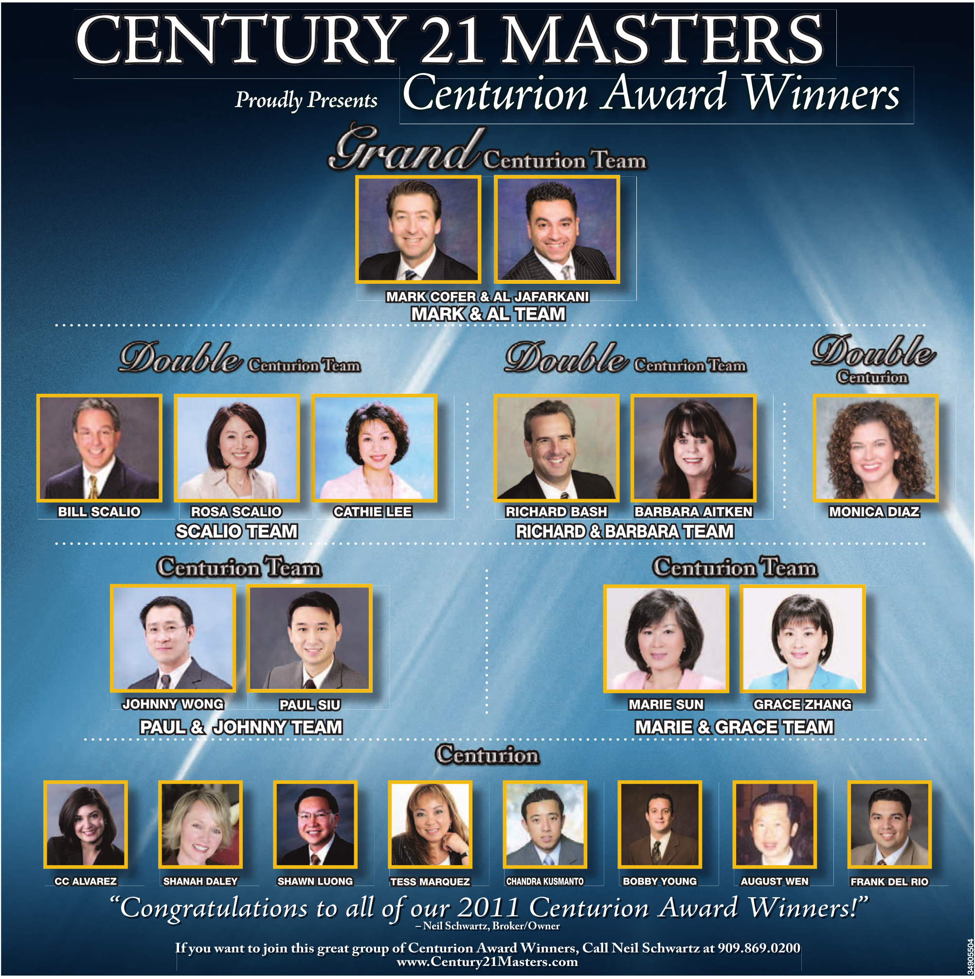 CENTURY 21 MASTERS Proudly Presents Centurion Award Winners MARK COFER & AL JAFARKANI MARK & AL TEAM BILL SCALIO ROSA SCALIO SCALIO TEAM CATHIE LEE RICHARD BASH BARBARA AITKEN RICHARD & BARBARA TEAM MONICA DIAZ JOHNNY WONG PAUL SIU PAUL & JOHNNY TEAM MARIE SUN GRACE ZHANG MARIE & GRACE TEAM CC ALVAREZ SHANAH DALEY SHAWN LUONG TESS MARQUEZ CHANDRA KUSMANTO BOBBY YOUNG AUGUST WEN “Congratulations to all of our 2011 Centurion Award Winners!” – Neil Schwartz, Broker/Owner If you want to join this great group of Centurion Award Winners, Call Neil Schwartz at 909.869.0200 www.Century21Masters.com FRANK DEL RIO