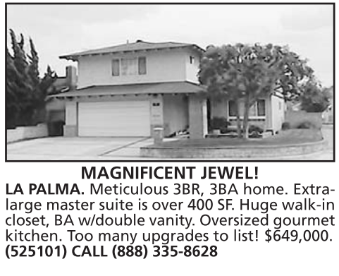 LA PALMA. Meticulous 3BR, 3BA home. Extralarge master suite is over 400 SF. Huge walk-in closet, BA w/double vanity. Oversized gourmet kitchen. Too many upgrades to list! $649,000. (525101) CALL (888) 335-8628