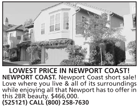NEWPORT COAST. Newport Coast short sale! Love where you live & all of its surroundings while enjoying all that Newport has to offer in this 2BR beauty. $466,000. (525121) CALL (800) 258-7630