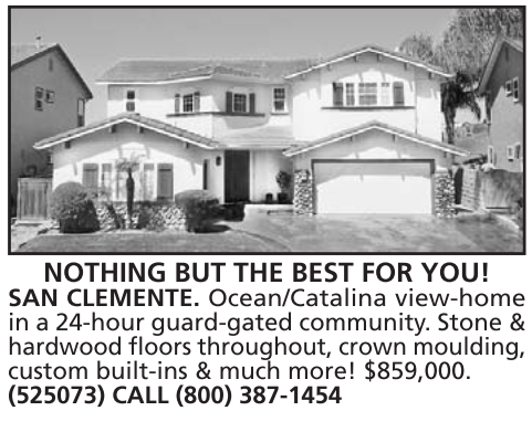 SAN CLEMENTE. Ocean/Catalina view-home in a 24-hour guard-gated community. Stone & hardwood floors throughout, crown moulding, custom built-ins & much more! $859,000. (525073) CALL (800) 387-1454